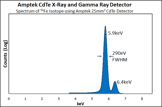 X 射线和伽马射线与 CdTe 原子相互作用,CdTe 中每损失 4.43 eV 能量,就会平均产生一个电子/空穴对。根据入射辐射的能量,这种能量损失主要由光电效应或康普顿散射决定。探测器“阻止”入射辐射并产生电子/空穴对的概率或效率随 CdTe 厚度的增加而增加。