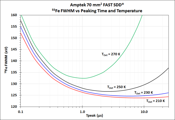 图 7.70 mm² FAST SDD® 探测器的分辨率与峰值时间和温度之间的关系。